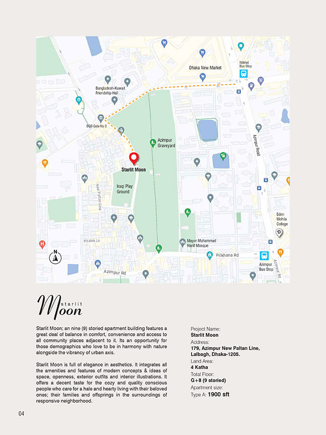 Starlit Moon @ Azimpur On Sale !! Address 179, Azimpur New Paltan Line, Lalbagh, Dhaka-1205. Land Area 4 Katha Total Floor G + 8 (9 storied building) Apartment Size 1900 sft Total Apartments 08 nos Car Parking 08 nos Design Architects' Wall Floor Plans Starlit Moon location car parking single unit plan